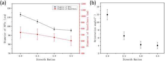 (a) Average diameters of 1% PVDF/BN NFYs; and (b) orientation angle of nanofibers along NFYs axis at different stretching ratios.