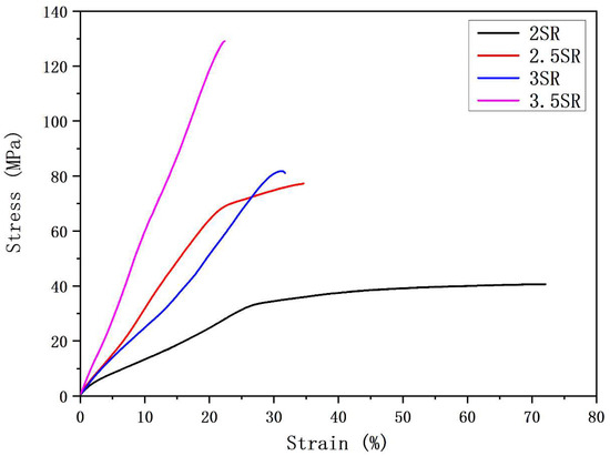 Stress-strain curves of 1% PVDF/BN NFYs at different stretching ratios.