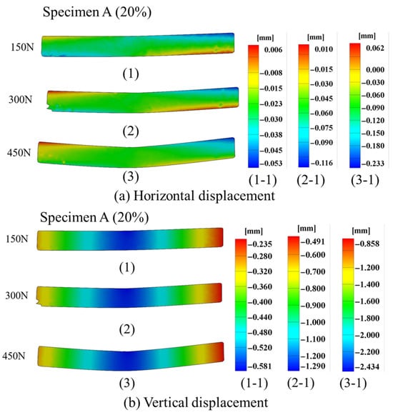 When the load increases from 150 N to 450 N, Figure 7 shows the displacement field distribution of the 3D-printed composites with different fiber volume fractions. The vertical displacement of the composite specimens was larger than the horizontal displacement, with maximum vertical displacements of 2.434 mm and 4.582 mm, respectively, as illustrated in Figure 7. As observed in Figure 7b,d, the vertical displacement increment of specimen A was smaller than that of specimen B under identical loading conditions. This phenomenon indicates that specimen A exhibits higher stiffness than specimen B. As the load increased to 450 N, the displacement field of specimen B showed missing data points. This occurrence signifies that specimen B failed at 450 N due to excessive deformation, rendering an accurate displacement field calculation impossible. In general, large deformation serves as an indicator of specimen failure. Simultaneously, this phenomenon correlates with the increase in AE signals and the cumulative hits of specimen B shown in Figure 3.