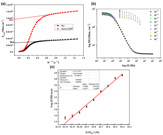 (a) Determination of surface coverage rates of the Au electrode. (b) Evolution of the impedance spectra (Bode diagram) as a function of the ClO4− ion concentration. (c) Calibration curve of the β-CDP layer as a function of the cologarithm of the perchlorate ion concentration (Error bars in red color represent standard deviation from 10 independent measurements).
