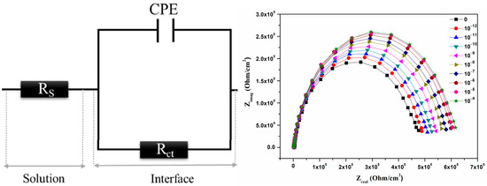 (Left) Equivalent circuit of Au/β-CDP/electrolyte interfaces. (Right) Variation of the impedance diagram of the Au/β-CDP structure as a function of the Zreal at different concentrations of the perchlorate ions.