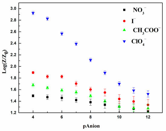 In comparison with the sensitivity of the active layer toward perchlorate anion, a relatively weak impedimetric response for the triplet tested anions was detected, indicating a minor interfering effect. The obtained result is in good agreement with the selectivity classification according to the Hofmeister theory (ClO4– → SCN– → I− → NO3– → Br– → Cl– → HCO3– → CH3COO– → SO42– → HPO42–) [59,60].
