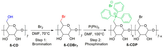 The phosphonium salt of β-cyclodextrin (β-CDP) was synthesized in two steps: bromination of β-cyclodextrin followed by phosphination of the resulting intermediate (β-CDBr7). The second step was carried out in DMF at 100 °C and yielded β-CDP as a fine powder (Scheme 1).