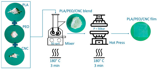 In detail, different concentrations of PEO and CNC were mixed with PLA in an internal mixer (Rheomix® 600 Haake, Vreden, Germany) with a volume capacity of 50 cm3, at 180 °C and at 50 rpm, for 3 min. Composite films were prepared by hot pressing the obtained melt using a Collin P300P (COLLIN Lab & Pilot Solutions GmbH, Maitenbeth, Germany) press at the same previous temperature value (P = 50 bar for 3 min).