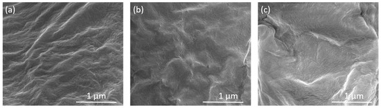 Moreover, the surface free energy (γs) of the PLA/PEO and PLA/PEO/CNC films was calculated, including its polar (γsp) and dispersive (γsd) components, using the Owens–Wendt method, based on contact angle measurements with water and diiodomethane. The obtained values are reported in Table 5 and indicate that surface energy is significantly influenced by both the irradiation dose of CNCs and the PEO content. For the PLA/1PEO system, the incorporation of CNCs led to slight variations in γs, with a general decrease in the polar component (γsp) as the irradiation dose increased. This trend suggests a reduction in the availability or surface exposure of polar –OH groups, likely due to the formation of compact aggregates or cross-linked domains that shield functional groups from the interface [53].