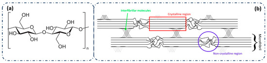 (a) Chemical structure of the cellulose repeating unit within the polymer structure. (b) Simplified structure of cellulose microfibrils, showing the presence of amorphous and crystalline zones. Adapted from Sabara et al. [42], licensed under CC BY 4.0.