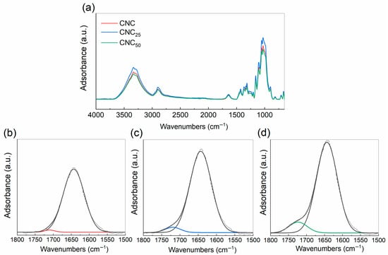 FTIR (a) of untreated CNC (black line) and CNC25 (red line) and 50 kGy (blue line) and deconvoluted range of C–O–C vibration bands related to data of untreated CNC (b), and CNC25 (c) and CNC50 (d) (1500–1800 cm–1). Within the (a–c) deconvoluted range, black dashed lines represent the acquired FTIR signals.