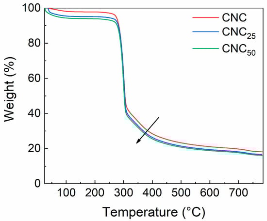 TGA data of CNC (red line), CNC25 (blue line), and CNC50 (green line). The arrow represents the thermal stability trend of unirradiated and irradiated CNCs.