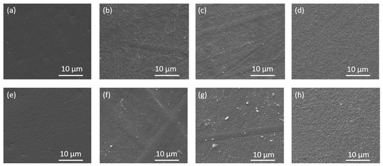 Morphological analysis of pure PLA films and nanocomposites with varying percentages of CNC was conducted to evaluate changes in the film surface. Figure 9 presents SEM micrographs of different types of films loaded with unirradiated and irradiated CNC at two different doses. In the analysis of the PLA/PEO film (Figure 9a,e), it is observed that as the percentage of PEO in the matrix increases, the population density of the polymer chain structure also increases. Consequently, when pure CNC powder is added to the PLA/2PEO/2CNC film, the CNC chains are incorporated into the matrix structure. In contrast, in the PLA/1PEO/1CNC film, the CNC chains are more free and therefore more visible on the surface of the sample. CNC25, having a structure with more free radicals, interacts more with the polymer matrix when added, altering its structure. In the PLA/1PEO/1CNC25 film, small stretches of the CNC chain remain visible on the surface, whereas in the PLA/1PEO/1CNC50 film, they are completely absorbed by the matrix, creating a more uniform and smoother surface. In the PLA/2PEO/2CNC25 films, fibrils and agglomerates appear in some areas of the surface. In the PLA/2PEO/2CNC50 films, the surface is homogeneous, but with a denser structure compared to the PLA/1PEO/1CNC50 film.
