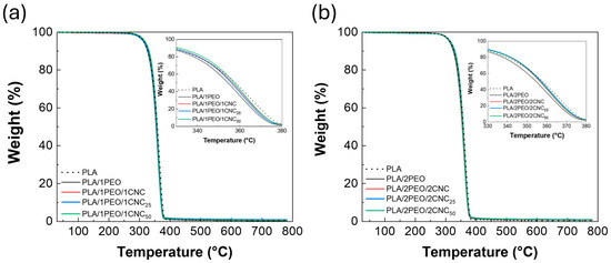 TGA data of PLA/PEO (a) and PLA/PEO/CNC composites (b).
