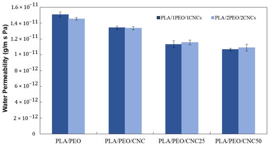 Water permeability data of PLA/PEO and of composite films containing pristine and irradiated CNC (blue bars: PLA/1PEO/1CNCs; light blue bars: PLA/2PEO/2CNCs).