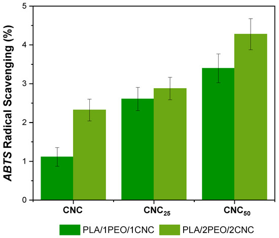 It is evident that films containing CNC25 and CNC50 exhibit higher ABTS•+ radical scavenging percentages compared to non-irradiated samples. Interestingly, CNC irradiation proves to be an effective method to enhance the antiradical activity of these PLA-based active films. Specifically, the incorporation of CNC25 into PLA/1PEO/1CNC films results in an approximately 30% increase in scavenging activity, while exposure to 50 kGy leads to a 50% improvement. Figure 13 also highlights the crucial role of the irradiation dose in enhancing the antiradical properties of these materials. The highest ABTS•+ scavenging activity is observed in films containing CNC50. However, at a dose of 25 kGy, the improvement in antioxidant properties appears to be better balanced with the amount of CNC added, particularly in the 1:1 PLA/PEO formulation, ensuring effective radical scavenging activity, while maintaining suitable mechanical and structural properties. Criado et al. [25] reported a 49% enhancement in the antioxidant activity of gellan gum films incorporating 20 wt% CNC-g-GA. In comparison, the present study achieved a similar increase (~50%) using only 1–2 wt% of electron beam-irradiated CNCs, demonstrating a more efficient antioxidant effect at significantly lower filler concentrations in PLA-based film. The improved antioxidant behavior can be attributed to the formation of long-lived radicals and surface carbonyl groups (such as aldehydes) on the CNCs during irradiation. These species contribute to the stabilization of the polymer matrix and enhance its antioxidant activity by scavenging free radicals or interrupting oxidative chain reactions [22,23,25]. The significant reduction in color change observed in the irradiated CNC-based films (Figure 7) further supports this effect, indicating that CNCs help scavenge radicals and stabilize the polymer structure, thereby limiting the formation of chromophoric degradation products typically associated with oxidative processes [57].