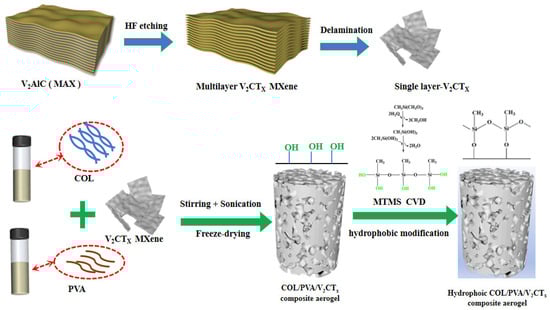 Flowchart of the preparation of hydrophobic COL/PVA/V2CTx composite aerogels.