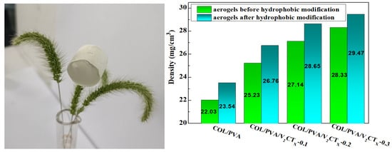 As shown in Figure 2, the prepared aerogels appeared to be light weight, as they could be placed on dog tail grass without obvious deformation. Moreover, the density of the hydrophobic COL/PVA/V2CTx composite aerogel gradually increased, along with the mass ratio of V2CTx, because the total mass added remained unchanged. However, if too much V2CTx (more than 0.3 wt%) was added, it was difficult for the mixture to become homogeneous and the V2CTx MXene was easily deposited at the bottom during the freezing process due to aggregation. Meanwhile, the strength of the aerogel was enhanced with increasing density, which is essential so that the aerogels remain dimensionally stable after adsorbing oils. In addition, the strength of the prepared aerogel was enhanced with increasing density, which is important for ensuring dimensional stability after adsorbing oils [29]. Thus, MTMS-modified COL/PVA/V2CTx-0.2 seemed to be a good choice as an oil adsorbent.