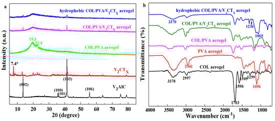 XRD patterns of V2AlC, V2CTx, and prepared aerogels (a). FTIR spectroscopy of COL, PVA, COL/PVA, COL/PVA/V2CTx, and hydrophobic COL/PVA/V2CTx aerogels (b).
