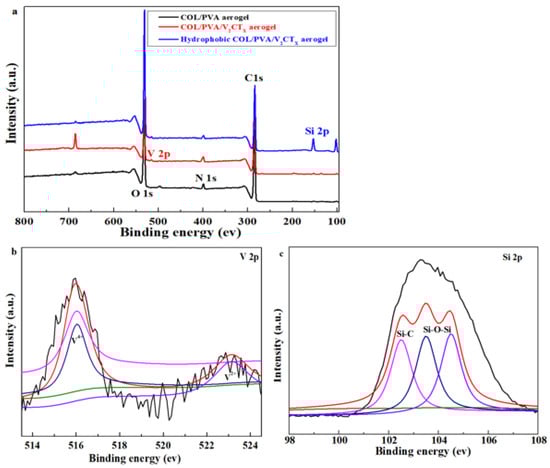 As shown in Figure 4a, the peaks of C 1s at 285 eV, O 1s at 533 eV, and N 1s at 400 eV are all distinctly found in the XPS spectra of the COL/PVA, COL/PVA/V2CTx, and MTMS-modified COL/PVA/V2CTx hybrid aerogels, which are the main peaks of collagen and polyvinyl alcohol [40]. Meanwhile, the peak at 516.1 eV, appointed to V 2p, can be seen for the COL/PVA/V2CTx composite aerogel, which further confirms that the V2CTx has been smoothly combined into the aerogel. In addition, the peak of V 2p and the peak at 102 eV—regarded as Si 2p—also appear in the hydrophobic COL/PVA/V2CTx composite aerogel, which illustrates successful hydrophobic modification via VCD. The atomic concentrations of C 1s, O 1s, N 1s, and V 2p in the COL/PVA aerogel are 75.09%, 22.26%, 2.65%, and 0%, respectively, which turn into 77.22%, 19.03%, 3.55%, and 0.21% in the COL/PVA/V2CTx aerogel. The change in atomic concentration is caused by the addition of V2CTx with C, O, V, and other atoms. In particular, the Si 2p atomic concentration is shifted from 0% to 2.74% in the COL/PVA/V2CTx composite aerogel before and after hydrophobic modification, which further reveals that the aerogel has been endowed with hydrophobicity. Figure 4b displays that the V 2p peaks at 516 eV and 523 eV are ascribed to V4+ and V2+. The peaks of Si 2p at 102.5 eV, 103.5 eV, and 104.5 eV are attributed to Si-CH, Si-CH3, and Si-O-Si, respectively, in Figure 4c, which indicates that the hydrophobic networks of Si-O-Si are formed in the aerogels, in accordance with the results of FTIR [35].