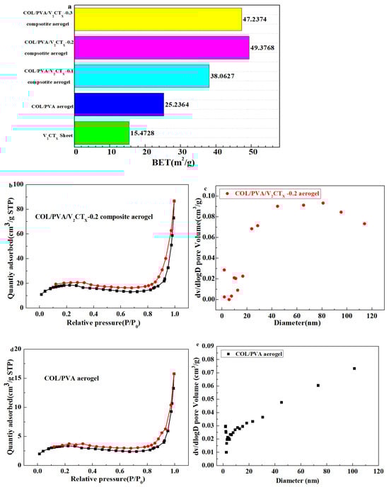 The specific surface area of prepared aerogels (a); N2 adsorption–desorption isotherms and pore size distribution of the hydrophobic COL/PVA (b,c) and COL/PVA/V2CTx-0.2 composite aerogels (d,e).