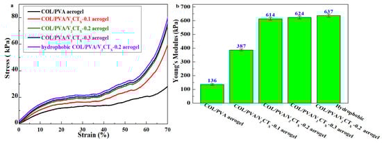 Typical stress–strain vertical axial compression curves (a) and Young’s modulus (b) of the aerogels.