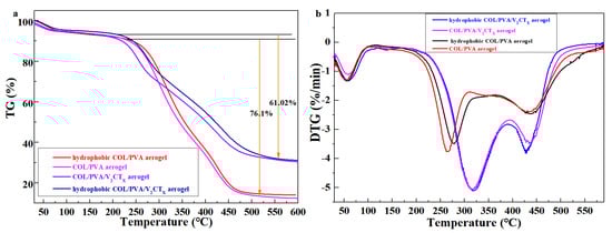 Figure 8a shows the TGA curves of the aerogels, which are used to evaluate the thermal stability of the materials. In Figure 7a, the residual weight percentage of the COL/PVA composite aerogel is 13.17%, while that of the COL/PVA/V2CTx aerogel is 31.35%, which results from the addition of V2CTx at a higher decomposition temperature. Meanwhile, the weight loss of the COL/PVA/V2CTx aerogel decreases 61.02% from 208 °C to 550 °C, which is less than that (76.1%) of the COL/PVA aerogel from 205 °C to 520 °C. After hydrophobic modification using MTMS, the residual weight percentage of the aerogels increases and the weight loss reduces, which is caused by the rigid polysiloxane coating slowing down the thermal decomposition of the modified aerogels. Moreover, the DTG curves in Figure 8b indicate that the COL/PVA/V2CTx aerogel thermally decomposed fastest at 320 °C, which is higher than the temperature (260 °C) of the COL/PVA aerogel’s decomposition. The fastest thermally decomposed temperature of the aerogels after hydrophobic treatment also improves due to the reaction between the aerogels and MTMS. Therefore, the hydrophobic COL/PVA/V2CTx composite aerogel with a better thermal stability is regarded as a new oil adsorbent that can be applied in worse environments, such as those with high temperatures.