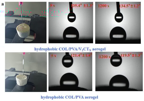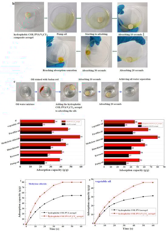 Moreover, the prepared COL/PVA/V2CTx and COL/PVA composite aerogels before and after hydrophobic modification were applied to adsorb various oils and solvents such as pump oil, vegetable oil, paraffin oil, kerosene, dimethicone, and methylene chloride; the absorption capacity is shown in Figure 9d,e. The results show that the adsorption capacities of the aerogels for oils were promoted after being modified by MTMS; this can be attributed to the introduction of the hydrophobic effect. The adsorption capacities of the hydrophobic COL/PVA/V2CTx aerogel ranged from 46 to 80 g/g, which is more than that (31–55 g/g) of COL/PVA, toward different types of oily liquids; this can be explained by the uniform alignment of numerous pores providing more space for oils, a bigger specific surface area offering more active sites for adsorbing oils, and a larger water contact angle with a stronger hydrophobic effect. In addition, the adsorption capacity is also affected by the density, viscosity, and surface tension of the adsorbed oil. Oils were adsorbed into the aerogel and were primarily stored in the macropores with the help of capillary forces and hydrophobic interactions.