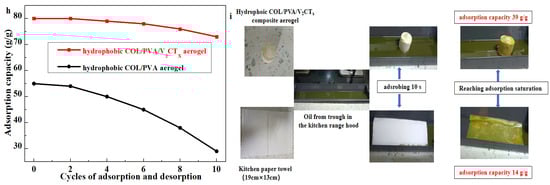 Among the adsorbed oils, the viscosity of vegetable oil is highest (44.5 mPa·s), while the viscosity of dichloromethane is lowest (0.43 mPa·s). Figure 9f,g reveal the relationship between the adsorption capacity of aerogels and adsorbing time. Compared with the hydrophobic COL/PVA composite aerogel, it took less time for COL/PVA/V2CTx to reach adsorption saturation, which benefited from the porous structure with more channels, larger specific surface area, and greater hydrophobic effect. In particular, 40 and 50 s were needed for the hydrophobic COL/PVA/V2CTx aerogel to completely adsorb methylene chloride and vegetable oil, which is less than the time needed by the hydrophobic COL/PVA composite aerogel. Meanwhile, the adsorption saturation of methylene chloride was more quickly reached in comparison to vegetable oil, which resulted from the viscosity of methylene chloride being less than that of vegetable oil, leading to the oil’s molecules moving more quickly. Therefore, the adsorption saturation for vegetable oil with a higher viscosity was achieved in a longer time. As shown in Figure 9f,g, the adsorption rate of modified aerogels for various oils was fast at the start but gradually reduced with time until the absorption process was completed. The variation in adsorption rate is explained by the available active sites that exist in the aerogels gradually decreasing until they are completely occupied by the adsorbed oil. The recyclability of adsorbents is a very important indicator in practical applications.