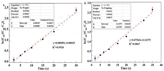 Pseudo first-order and pseudo second-order models are commonly and widely applied among various kinetics models of oil adsorption; they can be obtained by fitting the experimental data, respectively, to Equations (3) and (4) [45], as follows: