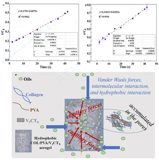 Pseudo first−order absorption linear fitting of (a) the COL/PVA/V2CTx aerogel and (b) the COL/PVA aerogel for methylene chloride. Pseudo second−order absorption linear fitting of (c) the COL/PVA/V2CTx aerogel and (d) the COL/PVA aerogel for methylene chloride. The adsorption mechanism of the COL/V2CTx aerogel for oils (e).