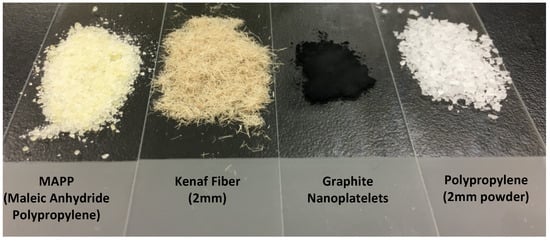 Images of polypropylene (PP), graphite nanoplatelets (G), kenaf fiber (K), and maleic anhydride polypropylene (MAPP).