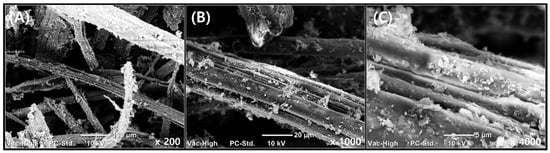 Representative microscopic images of pre-mixed GnP and kenaf at different magnifications: (A) ×200; (B) ×1000; (C) ×4000.