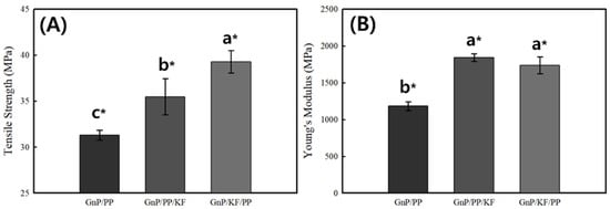 Tensile strength (A) and Young’s modulus (B) of PP-based composites as a function of GnP and KF mixing sequence. * indicates statistically significant differences between groups (p < 0.05), determined by Tukey’s HSD test. Data are presented as means ± standard deviations.