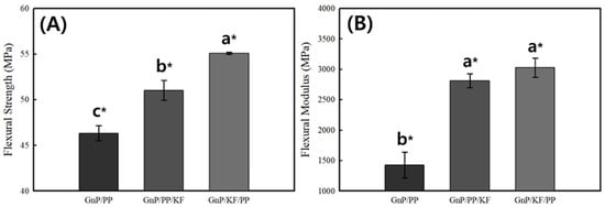 Flexural Strength (A) and Modulus (B) of PP-based composites as a function of GnP and KF mixing sequence. * indicates statistically significant differences between groups (p < 0.05), determined by Tukey’s HSD test. Data are presented as means ± standard deviations.