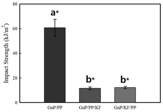 The impact test was conducted to evaluate the resistance of the composites to suddenly applied forces by measuring the impact energy absorbed prior to fracture. The IS results are presented in Figure 5. The GnP/PP composite exhibited an IS of 60.69 ± 6.92 kJ/m2, while the GnP/KF/PP and GnP/PP/KF composites showed IS values of 12.30 ± 0.91 kJ/m2 and 11.59 ± 1.07 kJ/m2, respectively. Although these values indicate a significant reduction compared to GnP/PP alone, both GnP/KF/PP and GnP/PP/KF composites demonstrated significantly enhanced impact resistance relative to neat PP (3.92 kJ/m2) reported in a previous study [27]. This substantial improvement in IS is primarily attributed to the synergistic reinforcement effects provided by GnP and KF, along with enhanced interfacial adhesion facilitated by the incorporation of MAPP. The combined action of GnP and KF effectively improved energy dissipation during impact loading, thus significantly enhancing the composite’s overall toughness and resistance to fracture compared to neat PP. According to previous studies, the fiber length is crucial in the physical and mechanical properties of the fiber-based composites. The fiber length, which was used in this study (2 mm), is relatively very short compared to the literature values. The relatively short fiber length may have further contributed to the reduced impact resistance, as long fibers are generally more effective in dissipating impact energy through fiber pull-out and crack bridging mechanisms. Similar trends have been reported in previous studies, where the incorporation of short natural fibers into thermoplastics led to a decrease in IS [28,29], whereas composites reinforced with long fibers demonstrated improved impact resistance [30]. Based on these findings, fiber length within the thermoplastic matrix plays a crucial role in determining energy absorption capability and overall mechanical performance.