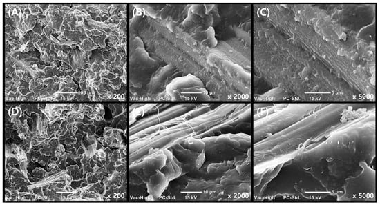SEM images of tensile fracture surfaces of PP composites: (A–C) GnP/KF/PP; (D–F) GnP/PP/KF at ×200, ×2000, and ×5000, respectively.