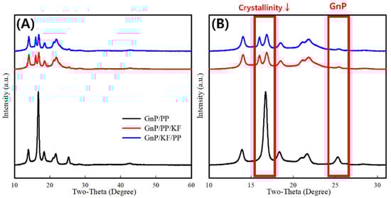 PP was then added, and MAPP was introduced last. Each suspension underwent an extra 30 min of ultrasonication to ensure thorough mixing. The mixtures were filtered, dried at 100 °C for 24 h to remove residual IPA, and compounded in a co-rotating twin-screw extruder (HAAKE MiniLab II Micro Compounder, Thermo Scientific Inc., Waltham, MA, USA) at 220 °C and 150 rpm. The extrudates were pelletized using a pelletizer (Benchtop 25 Lab Series, Bay Plastic Machinery, Bay City, MI, USA) and then molded into standard specimens using an injection molding machine (Model 150A, LNS Tech, Yucaipa, CA, USA) at a cylinder temperature (Tcylinder) of 200 °C and a mold temperature (Tmold) of 80 °C. A control sample (GnP/PP) without KF was prepared following the same procedure for comparison.