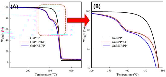 TGA curves of PP-based composites with different filler addition sequences: GnP/PP, GnP/PP/KF, and GnP/KF/PP. (A) Full-range TGA curves up to complete decomposition. (B) Magnified view of the degradation region (300–500 °C).