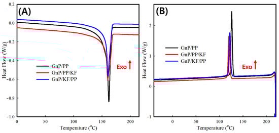 DSC was performed to investigate the crystallization and melting behaviors of composites (Figure 9 and Table 3). Consistent with the XRD findings, DSC analysis indicated a reduction in crystallinity for GnP/KF/PP and GnP/PP/KF composites compared to the GnP/PP composite. Previous studies have reported increased crystallinity upon kenaf fiber addition [17,25,39]; however, the current results suggest that KF limited polymer chain mobility, thereby reducing crystallinity. This decrease is attributed to the hindered segmental alignment of polymer chains during crystallization due to the presence of KF.