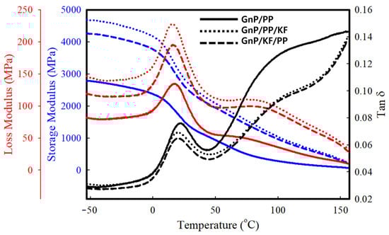 Storage modulus, loss modulus, and tan δ of PP-based composites with different filler addition sequences (GnP/PP, GnP/PP/KF, and GnP/KF/PP) as a function of temperature.
