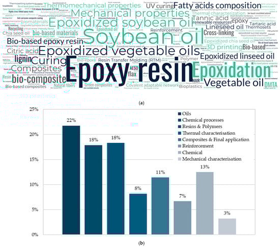 Figure 1b shows a distribution bar chart grouped in the topics explained above. It can be seen that most of the keywords used were related to oils (21.8% of the keywords). After that, chemical processes and resins and polymers were strongly used. Most common chemical processes were related to curing kinetics and crosslinking actions occurring during the study. After that, words indicate either the epoxidation or some modification processes needed to obtain the raw material. Keywords related to resins and polymer were mainly “Bio-based epoxy resin” “Epoxy resin” and “thermoset”. These studies focused not only on the epoxidation process, but also on the resin elaboration. It is worth it to note that mechanical characterisation-related keywords (4.3%) were the lowest found across the studies. This means that most of the studies did not provide meaningful results regarding the mechanical performance of the different resins. This is a promising gap considering that the studies have been found in several peer-reviewed journals.