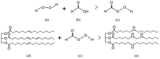 The epoxidation process is mainly achieved through the Prileschajew reaction. This reaction involves converting alkenes into epoxides by peracid, typically performic acid (formic acid + hydrogen peroxide) or another peroxy acid as the oxidising agent. When mixed with the oil, peracid donates an oxygen atom to the alkene, thus forming a three-membered epoxide ring as depicted in Figure 5. This reaction is widely studied and recognised as the standard method to produce epoxidised vegetable oils [16].