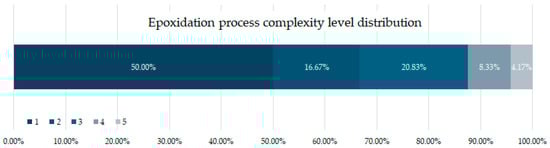 Epoxidation processes classified under complexity level 2 and 3 (16.67–20.83% of the studies) comprise reactions with higher temperatures (80–100 °C) and longer process times (6–8 h) required to achieve efficient conversion. Moreover, these conditions need to be monitored and controlled due to detonation risks. A longer reaction time and higher temperature translates into a higher energy consumption, thus, making the process less economically profitable and environmentally sustainable compared to level 1. Furthermore, auxiliary chemical agents such as toluene [77], photo initiators [36], and more toxic acids such as hydrochloric acid [78] not only increase the operational challenges, but also raise waste management, disposal, and potential environmental impact concerns. Finally, while these high-complexity methods may improve epoxidation efficiency, they also introduce significant technical and environmental trade-offs that must be carefully evaluated.