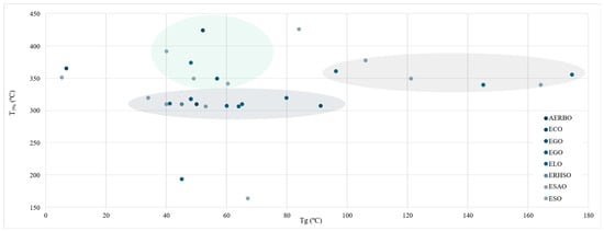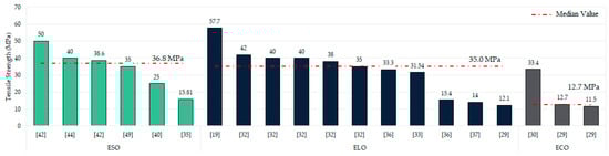 Regarding these properties’ influence on resins developed, Figure 4 shows a dispersion chart on oxirane oxygen content over tensile strength. A normal distribution according to the gathered data was depicted to contextualise the influence of this property. As discussed, oxirane oxygen content reflects the number of epoxide groups available for crosslinking, thus directly influencing the mechanical properties [69]. Typically, a higher oxirane oxygen content enables enhanced crosslink density. Nevertheless, this performance is also influenced by both the epoxidation process and hardener/catalyst used. Thus, high oxirane content reported brittleness, as the network might become too rigid, reducing the resin’s toughness.