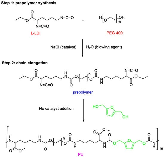 Water was utilized as a blowing agent at a concentration of 5.6 wt% relative to PEG 400. PEG 400, distilled water, and NaCl catalyst (4 wt% based on the initial PEG 400 amount) were combined in a plastic container and stirred using a mechanical mixer. L-Lysine ethyl ester diisocyanate (L-LDI) was then introduced at a molar ratio of 2.5:1 with respect to PEG 400, and the mixture was thoroughly agitated. The blend was heated to 70 °C and maintained for one hour until the diisocyanate was fully consumed. The resulting prepolymer appeared as a colorless gel [14]. The reaction progress was monitored by FT-IR spectroscopy by tracking the isocyanate peak corresponding to free isocyanate groups in the prepolymer. The isocyanate content was monitored with a titration test using bromophenol blue indicator and hydrochloric acid, until a constant value was reached (see Supporting Information).