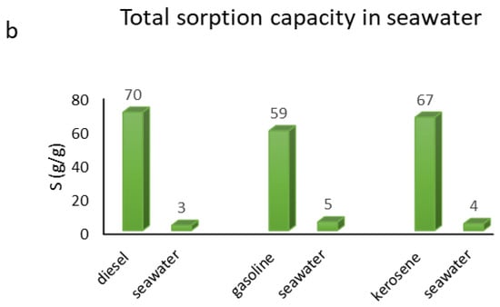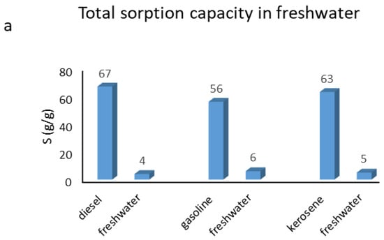 These results suggest that both physical and chemical properties of the oils influence the sorption performance of the PU foam. The higher sorption observed in seawater compared to freshwater for all tested fuels may be attributed to the increased ionic strength and presence of salts, which can enhance phase separation and promote oil sorption by reducing the oil–water interfacial tension.