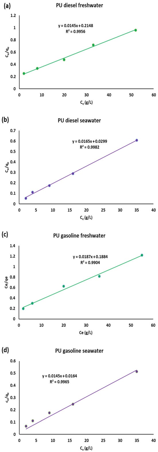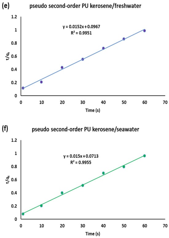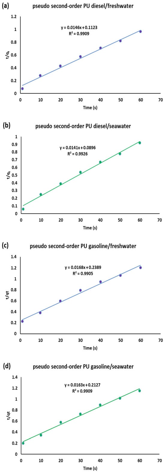 Figure 3 presents the kinetic plots corresponding to the pseudo-second-order model for the sorption of gasoline, diesel, and kerosene onto polyurethane (PU) in both freshwater and seawater samples.