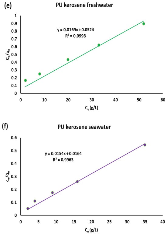 Langmuir models for the sorption of diesel, gasoline, and kerosene onto PU in freshwater (a,c,e) and in seawater (b,d,f).