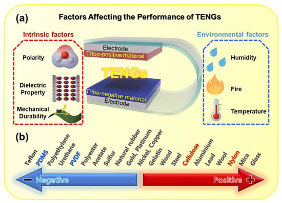 (a) Schematic illustration of factors influencing triboelectric nanogenerators (TENGs). (b) Triboelectric series.