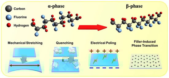Various methods have been employed to increase the β-phase content in PVDF. These include mechanical stretching [45,46], which physically aligns the polymer chains; electrical poling [47], which orients the dipoles through an external electric field; and rapid quenching from high temperature [48], which kinetically traps the chains in the desired conformation (Figure 3). Additionally, chemical approaches such as copolymerization with trifluoroethylene (PVDF-TrFE) or poly(methyl methacrylate) and the incorporation of nanofillers or additives can facilitate the nucleation and stabilization of the β-phase [49]. These additives, including BaTiO3 nanoparticles, carbon-based nanomaterials, and ionic liquids, have been shown to interact with PVDF chains and promote dipole alignment.