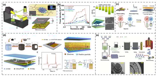 Design strategies for PVDF/carbon-based composite TENGs. (a) PVDF/graphene quantum dot composite nanofiber. Reproduced with permission [51]. Copyright © 2019, Elsevier. (b) PVDF/graphene nanosheet composite nanofiber. Reproduced with permission [52]. Copyright © 2021, Elsevier. (c) PVDF/graphene nanofiber. Reproduced with permission [53]. Copyright © 2024, Elsevier. (d) PVDF/graphene oxide composite. Reproduced with permission [54]. Copyright © 2025, Elsevier. (e) PVDF/graphene nanoplatelet. Reproduced with permission [55]. Copyright © 2024, Wiley-VCH GmbH.