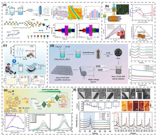 Design strategies for PVDF/non-carbon-additive-based composite TENGs. (a) PVDF/BaTiO3 composite nanofiber. Reproduced with permission [57]. Copyright © 2023, Elsevier. (b) PVDF/Fe3O4 composite nanofiber. Reproduced with permission [58]. Copyright © 2018, American Chemical Society. (c) PVDF-HFP/MXene composite fiber. Reproduced with permission [60]. Copyright © 2024, Elsevier. (d) PVDF/MoS2 composite. Reproduced with permission [61]. Copyright © 2025, Elsevier. (e) PVDF/MOF composite nanofiber. Reproduced with permission [62]. Copyright © 2023, Elsevier. (f) PVDF/AgNW composite nanofibers. Reproduced with permission [63]. Copyright © 2017, WILEY-VCH Verlag GmbH & Co. KGaA, Weinheim, Germany.