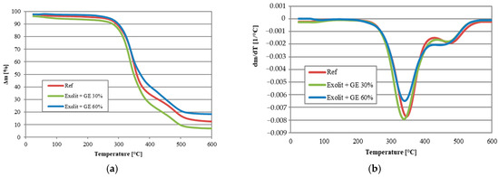 The TGA results are consistent with the mechanism of action of phosphor modifiers, which undergo transformations at higher temperatures that lead to the formation of phosphate layers that limit mass and heat transfer. The combination of Exolit and GE at a concentration of 60 wt.% proved to be particularly effective, with both components increasing thermal stability and resulting in a significantly higher residual amount. This observation confirmed the formation of an effective thermal barrier.